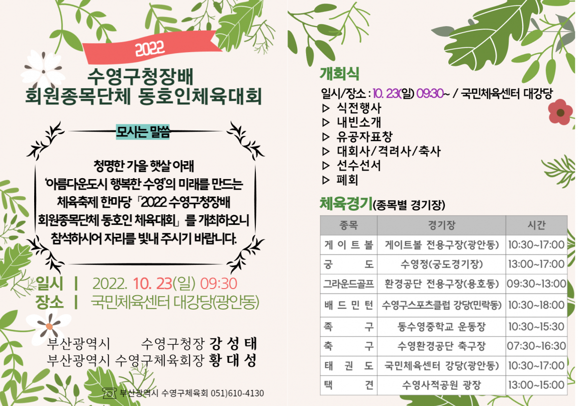 2022 수영구청장배 회원종목단체 동호인체육대회 안내 페이지 정보 작성일 22-10-17 09:24 본문 목록 이전글2023 계묘년 새해인사 22.12.28 다음글신나는주말학교 골프교실 참가자 모집 안내 22.09.20