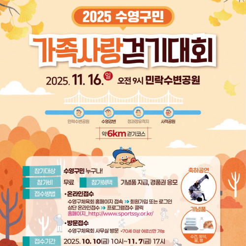 위 안내사항을 숙지하여 2025년수영구민가족사랑걷기대회를 신청해주시길바랍니다. 감사합니다.